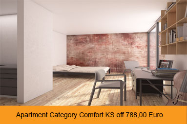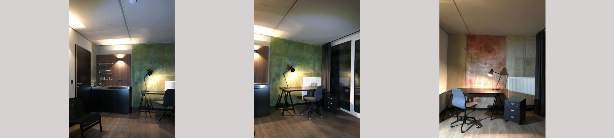 The loft-style studio apartments offer room-high windows with sun protection, individually glazed concrete walls, alternating with brightly designed wall surfaces. The floor in the living area is designed with a high-quality vinyl floor in wood look. Four studio apartments are barrier-free with a separate extra large bathroom with shower.